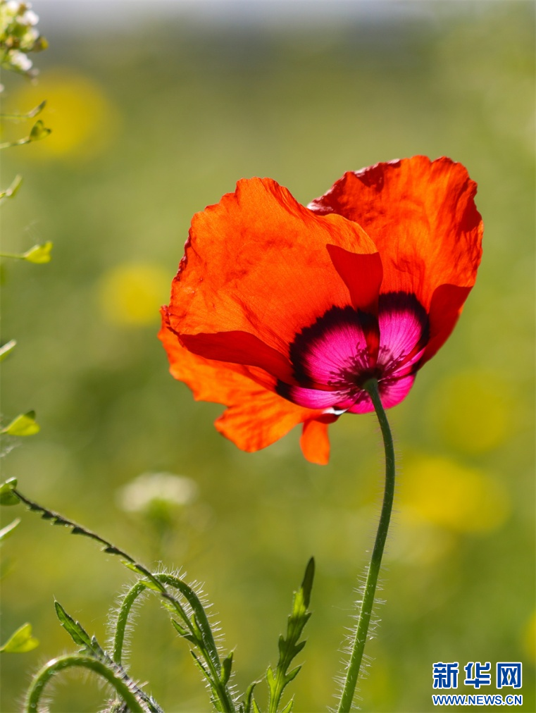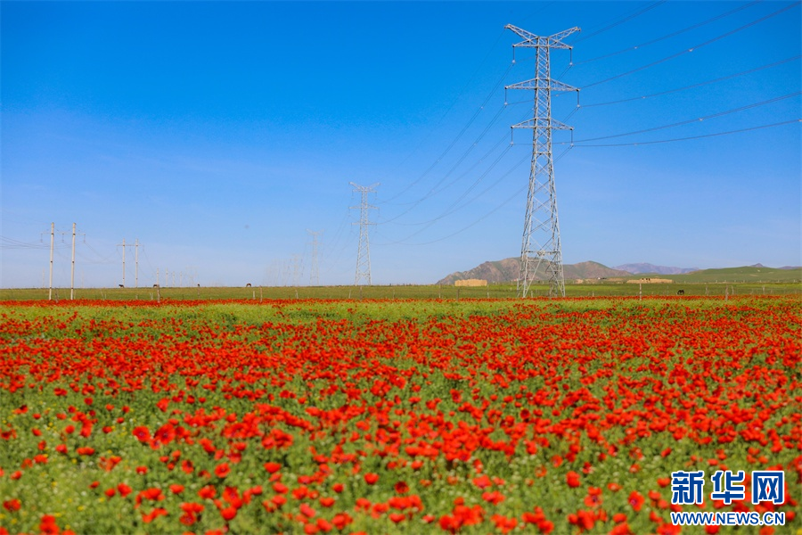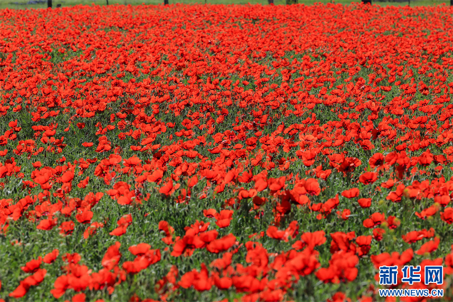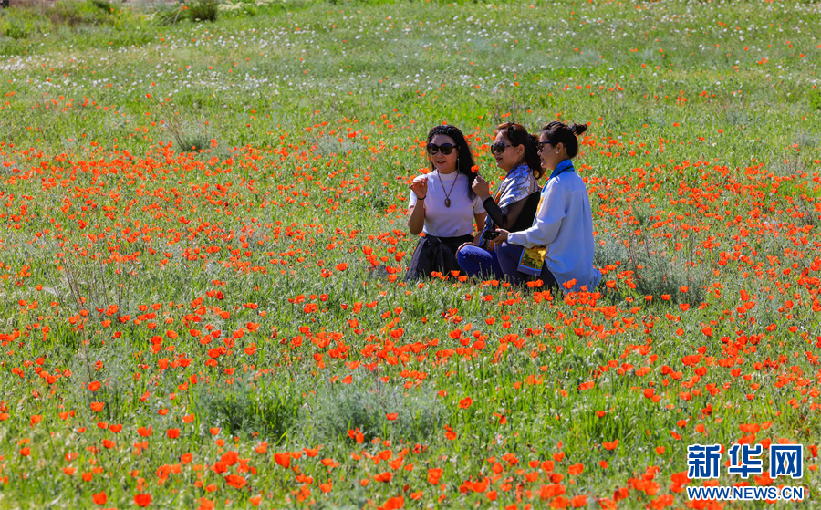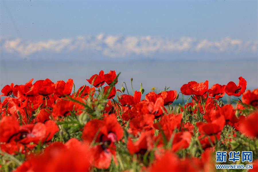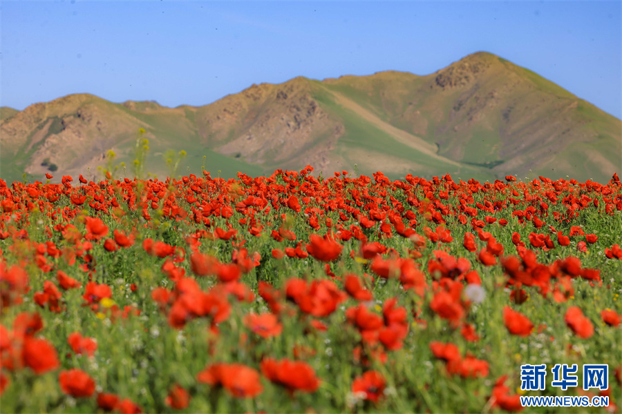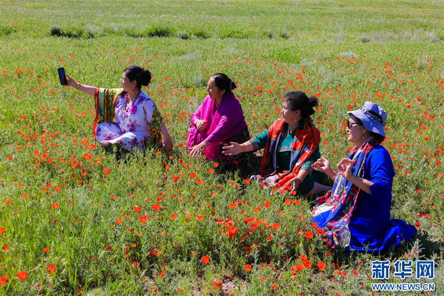 天山红花,又称虞美人,被当地人称为“自由迁徙的花”。它的花朵呈鲜艳的红色,花瓣轻薄柔软,丝绸般的质感在阳光下闪烁着迷人的光泽。其花朵基部有一黑红色不封口的环,这也是它区别于其他花卉的显著特征。花期一般在每年5月的中上旬,花期短暂,只有15天左右。每年花期,大片的红花像是天边飘落的云霞,铺满草原,形成一片红色的海洋,与周边绿色的草地、远处洁白的雪山相互映衬,色彩对比强烈,宛如大自然精心绘制的油画。