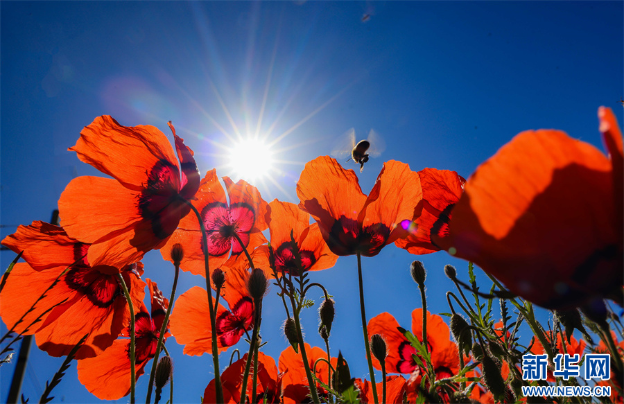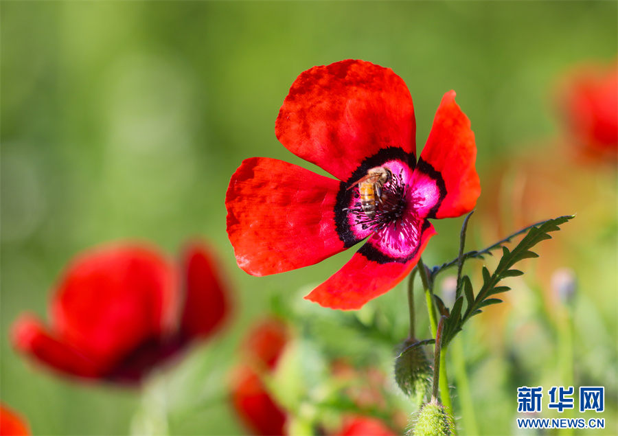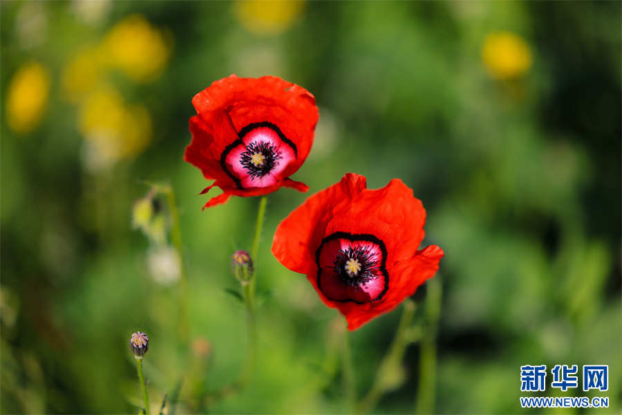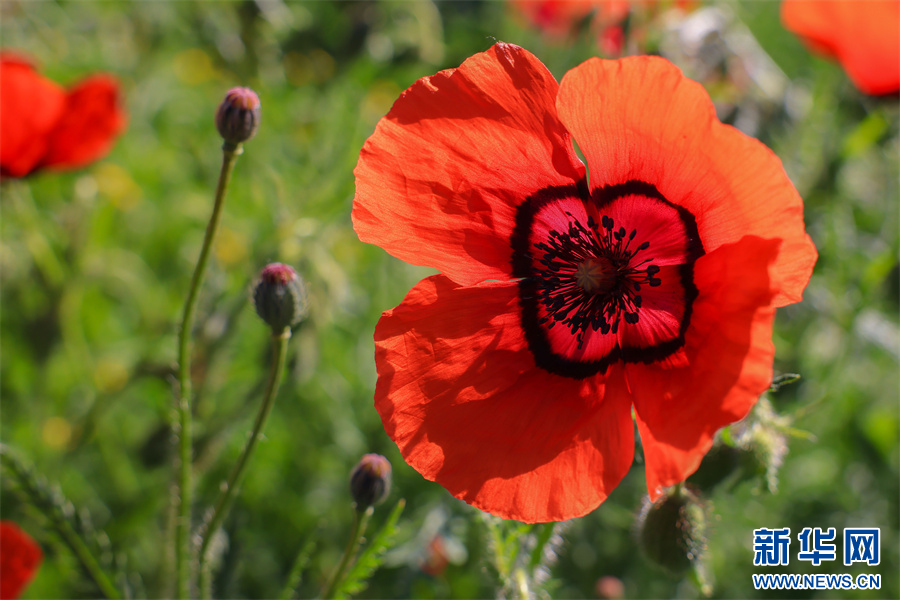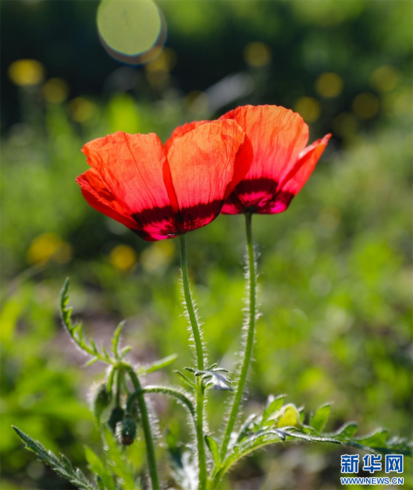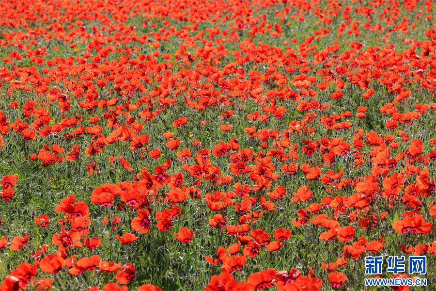 天山红花,又称虞美人,被当地人称为“自由迁徙的花”。它的花朵呈鲜艳的红色,花瓣轻薄柔软,丝绸般的质感在阳光下闪烁着迷人的光泽。其花朵基部有一黑红色不封口的环,这也是它区别于其他花卉的显著特征。花期一般在每年5月的中上旬,花期短暂,只有15天左右。每年花期,大片的红花像是天边飘落的云霞,铺满草原,形成一片红色的海洋,与周边绿色的草地、远处洁白的雪山相互映衬,色彩对比强烈,宛如大自然精心绘制的油画。