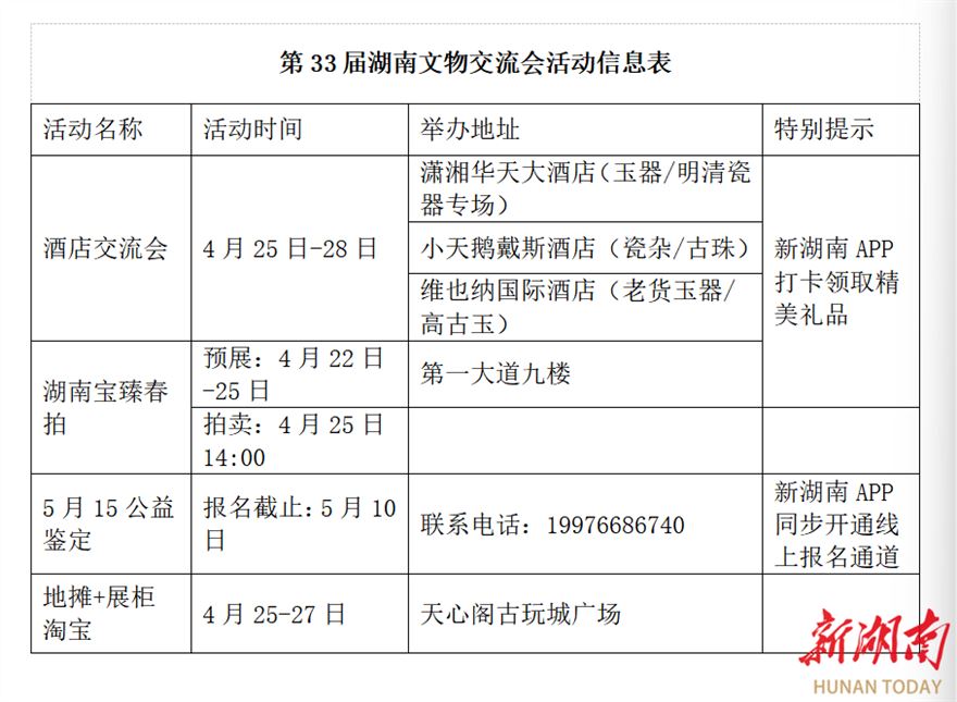 备受瞩目的第33届湖南文物交流会又来啦!记者4月17日从湖南朗溪文物商店获悉,第33届湖南文物交流会将于4月25日至28日在长沙举行。