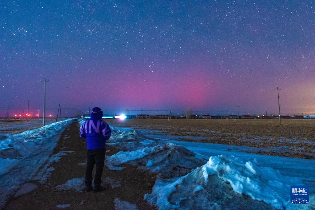 3月22日,摄影爱好者在黑龙江省佳木斯市富锦市大榆树镇观测极光。