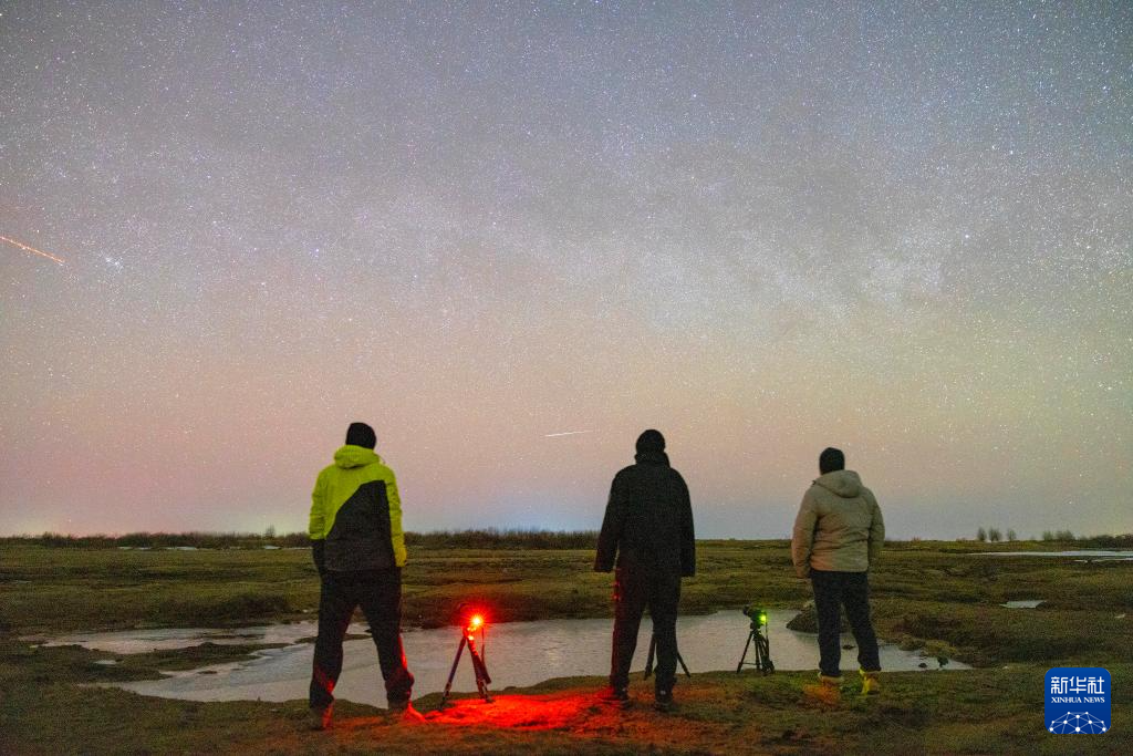 3月23日凌晨,摄影爱好者在黑龙江省双鸭山市集贤县拍摄极光。