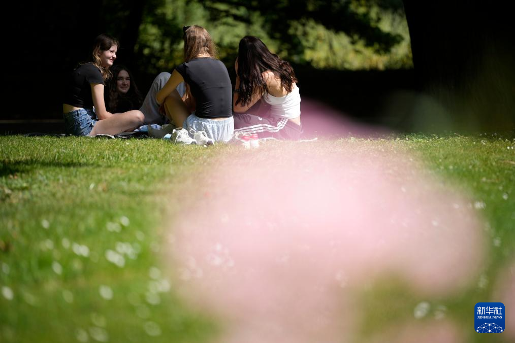 6月30日,在波兰首都华沙,几名年轻人坐在斯卡雷谢夫斯基公园的草地上聊天。