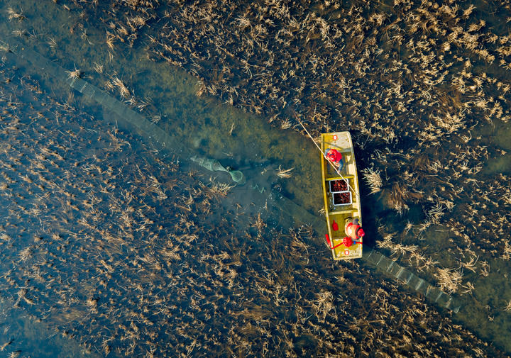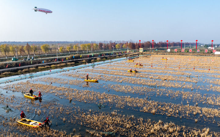2024年12月28日,虾农在湖北潜江后湖虾稻共作立体模式试验示范基地捕捞小龙虾(无人机照片)。当日,潜江龙虾冬捕活动在湖北省潜江市举行。新华社记者 胡竞文 摄