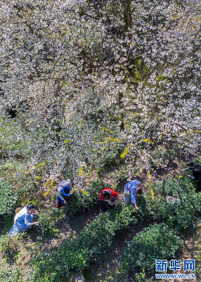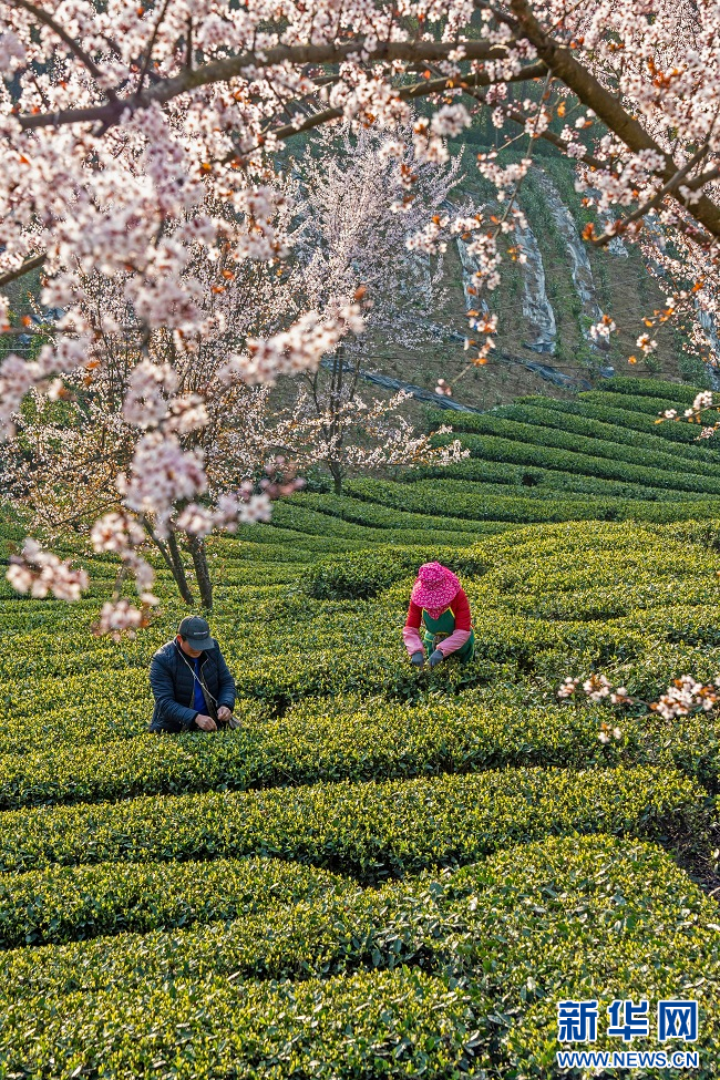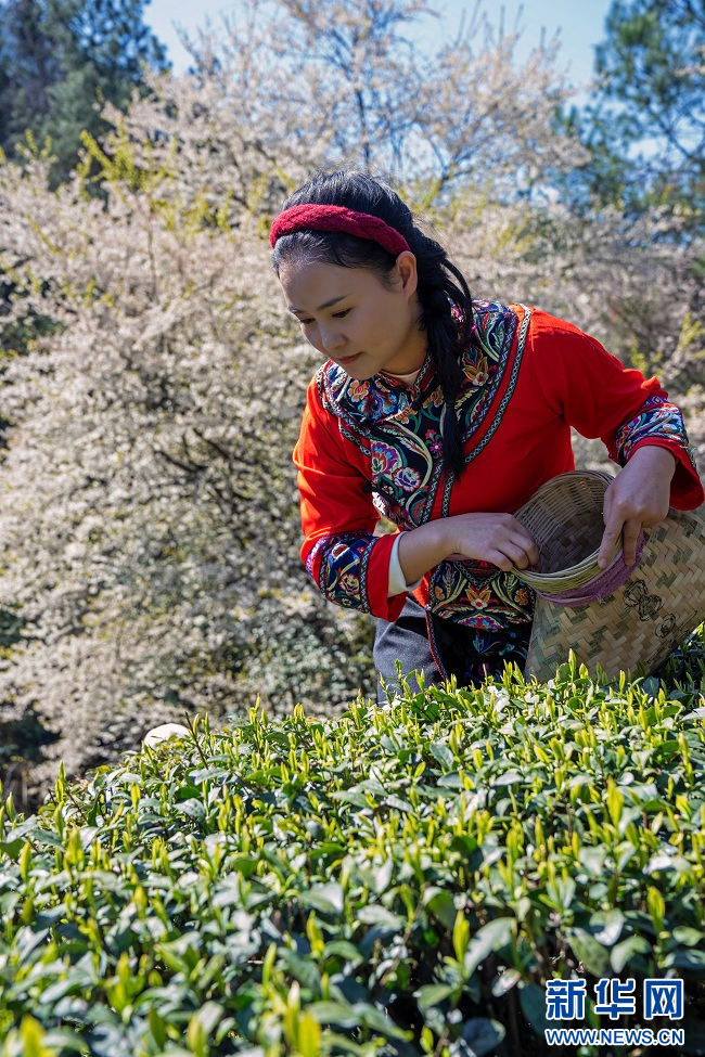 图为恩施州利川市忠路镇凤凰村土家族姑娘在樱花树下采春茶。新华网发 文林摄
