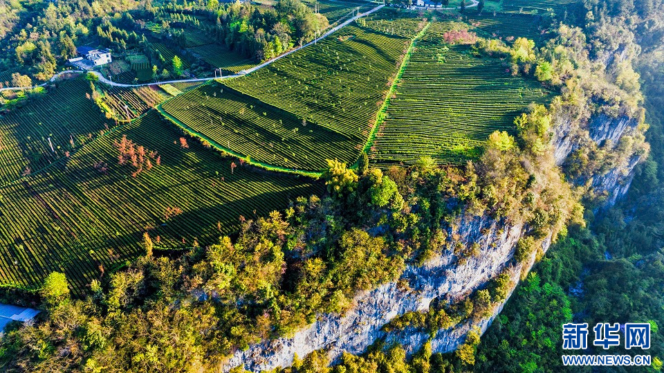 图为恩施州恩施市屯堡乡马者村绝壁上的茶园基地。新华网发 文林摄