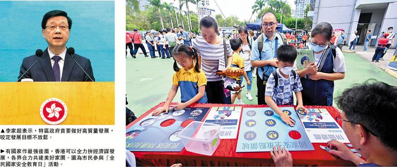 左图:李家超表示,特区政府首要做好高质量发展,咬定发展目标不放松。右图:有国家作最强后盾,香港可以全力拼经济谋发展,各界合力共建美好家园。图为市民参与“全民国家安全教育日”活动。