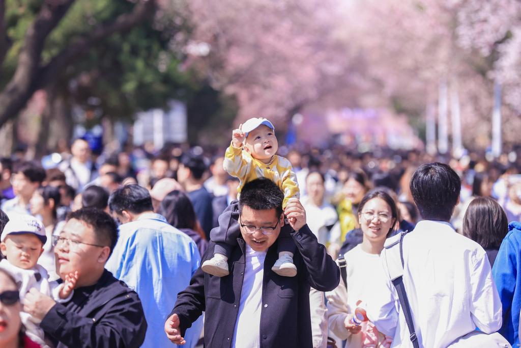 吉林大学南岭校区的杏花大道上,游客们漫步赏花。新华社发