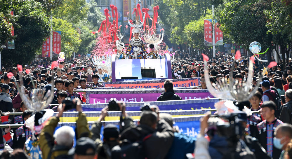 在贵州雷山县县城,苗族群众身着盛装,载歌载舞参加苗年和鼓藏节的巡游活动(2023年11月16日摄)。新华社记者 杨楹 摄