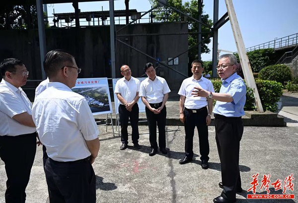 (5月28日,沈晓明在怀化市全城污水处理厂实地察看进水口采样点、中控室和实验室,了解监测数据记录、水样检测等情况。)