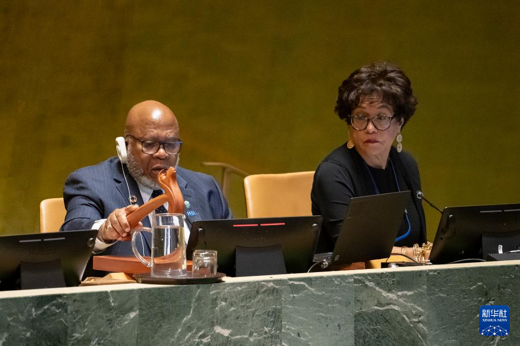 5月10日,在位于纽约的联合国总部,联大主席丹尼斯·弗朗西斯(左)落锤宣布决议通过。新华社发(联合国供图/曼努埃尔·伊莱亚斯摄)