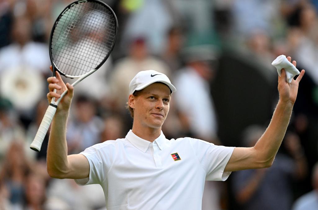 7月3日,辛纳在比赛后庆祝胜利。新华社记者 李颖 摄