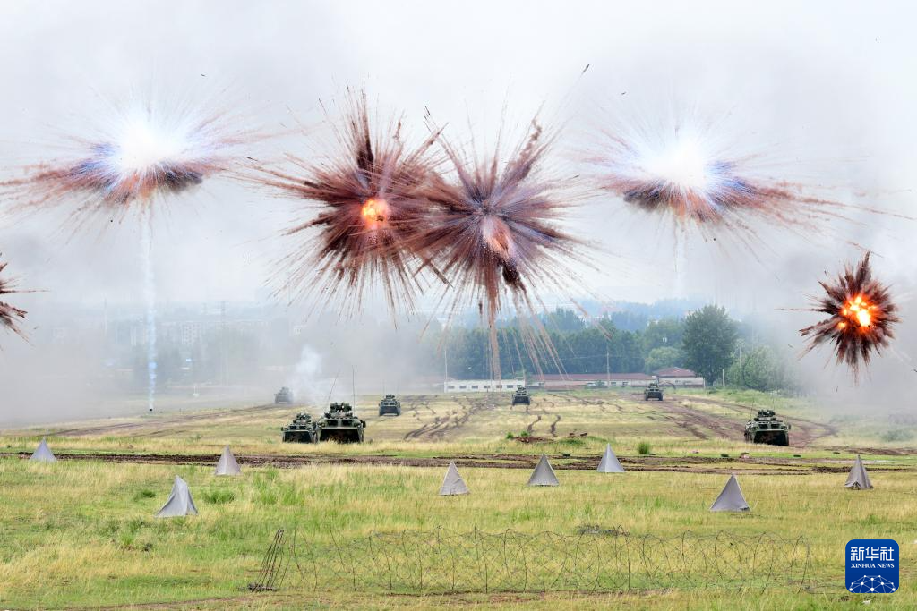 演练中,陆军某合成旅“杨根思连”步战车在烟幕弹掩护下发起战斗冲击(2023年7月29日摄)。新华社发(季鹏 摄)