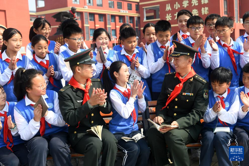 陆军某合成旅“杨根思连”的张赛浦(前排右)、肖荣基和驻地“杨根思小学”的学生共同学习老连长杨根思的英雄事迹(2023年10月13日摄)。新华社发(季鹏 摄)