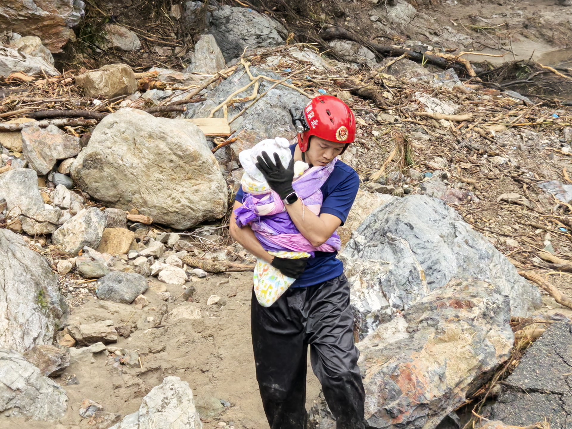 7月28日上午,当消防员蒋寒阳用床单将4个月大的婴儿裹在胸前时,孩子稚嫩的脸庞近在咫尺。蒋寒阳刻意放缓了自己的呼吸,一是怕喘粗气惹哭孩子,二是让自己的心态“稳一稳”,因为接下来,他将抱着孩子爬过一处绝壁——一段公路被洪水冲垮,只剩裸露的山体岩石,而这处绝壁正是通往山下的必经之路。