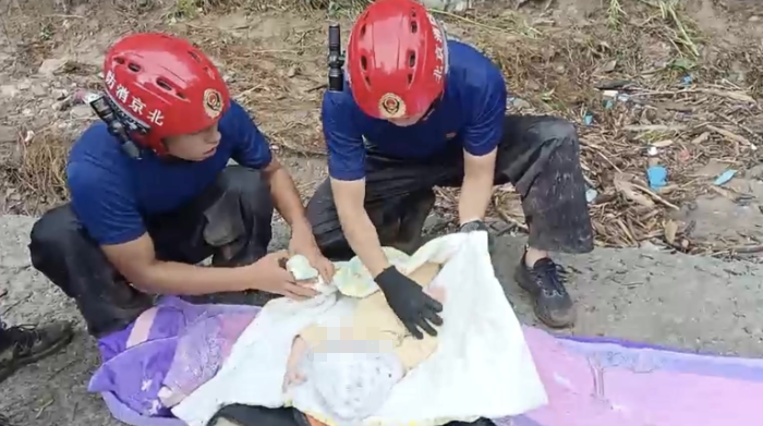 蒋寒阳和队友先用婴儿被包裹好孩子。