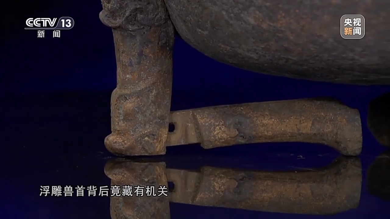 武王墩墓的五件青铜甗,造型纹饰素淡简约,属于战国晚期普遍风格,仔细探查,其中一只却大有玄机,奥秘就在它的立足中肘,浮雕兽首背后竟藏有机关,可使三足折叠90度,整尊甗似瑞兽由立变卧,仪态观感立时不同。这种折叠设计,在今天看来何其普通,但在久远的青铜时代,却极为罕见,对材质工艺都要求甚高。