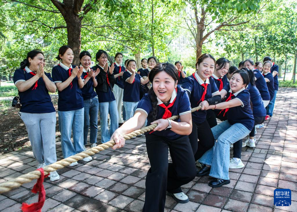 5月9日,河南省博爱县清化镇卫生院护士在“忆童年”主题趣味运动会上拔河。新华社发(程全摄)