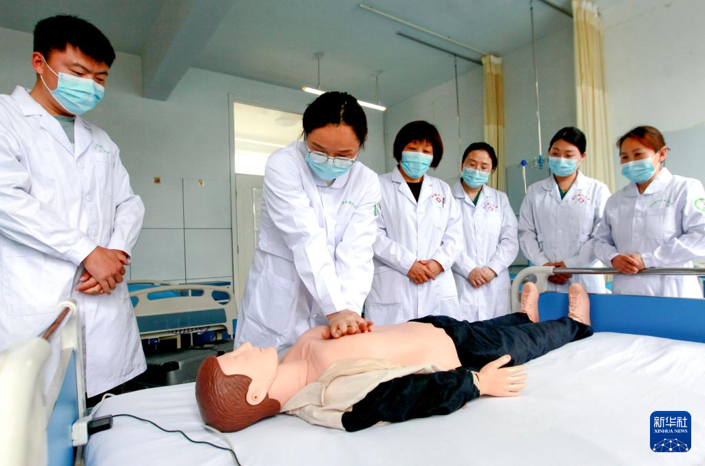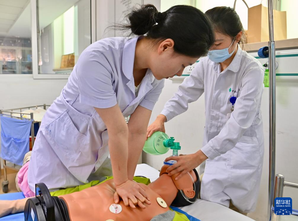 5月8日,在位于沈阳的中国医科大学附属第一医院内,实习护士在练习心肺复苏术。新华社记者 吴青昊 摄