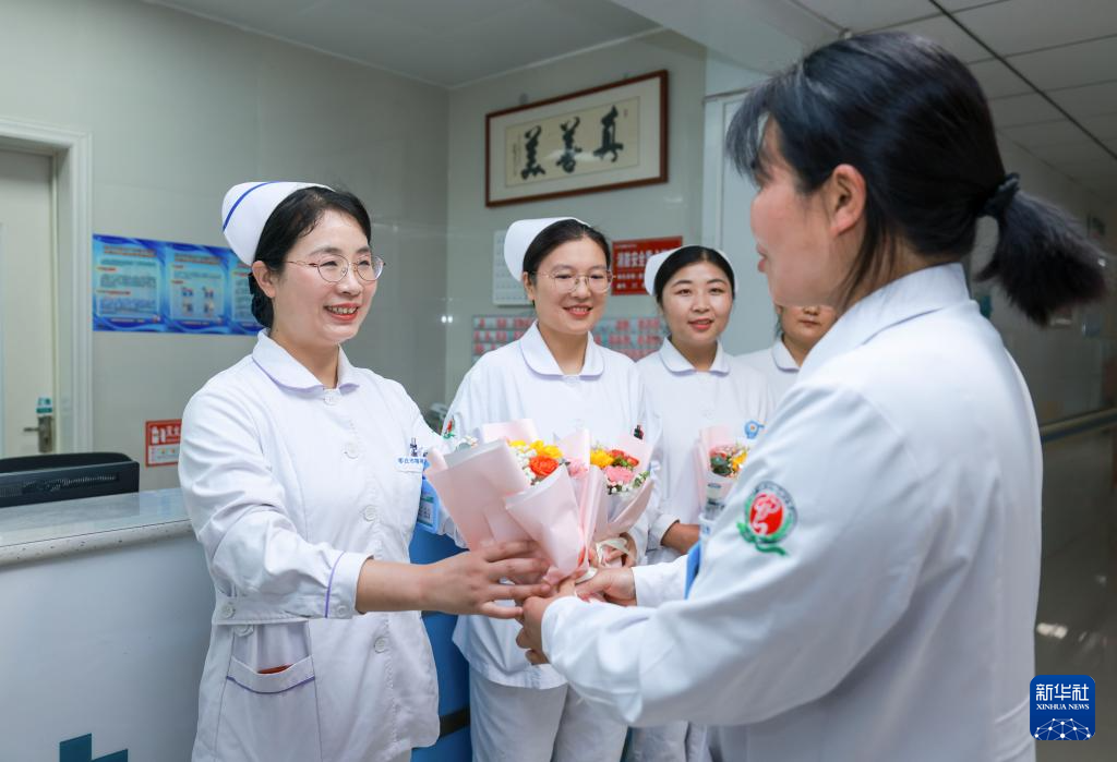 5月10日,在山东省枣庄市精神卫生中心,医生给护士献花。新华社发(王龙飞摄)
