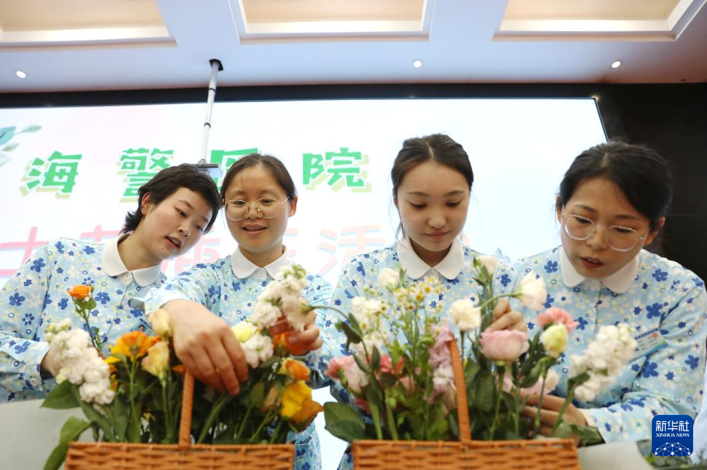 5月9日,在浙江省嘉兴市,海警医院护士参加插花活动。新华社发(金鹏摄)