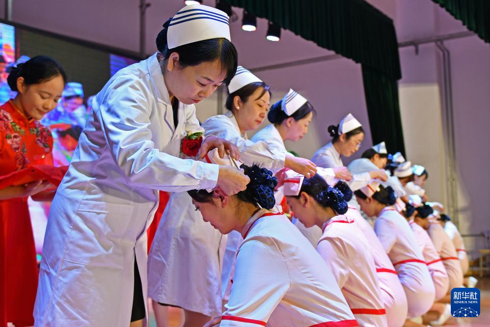 5月8日,在山东省烟台护士学校举行的护士节授帽仪式上,资深护理人员为学生授帽。新华社发(孙文潭摄)