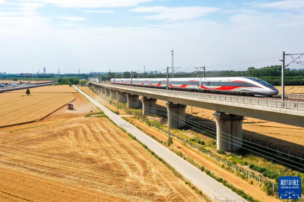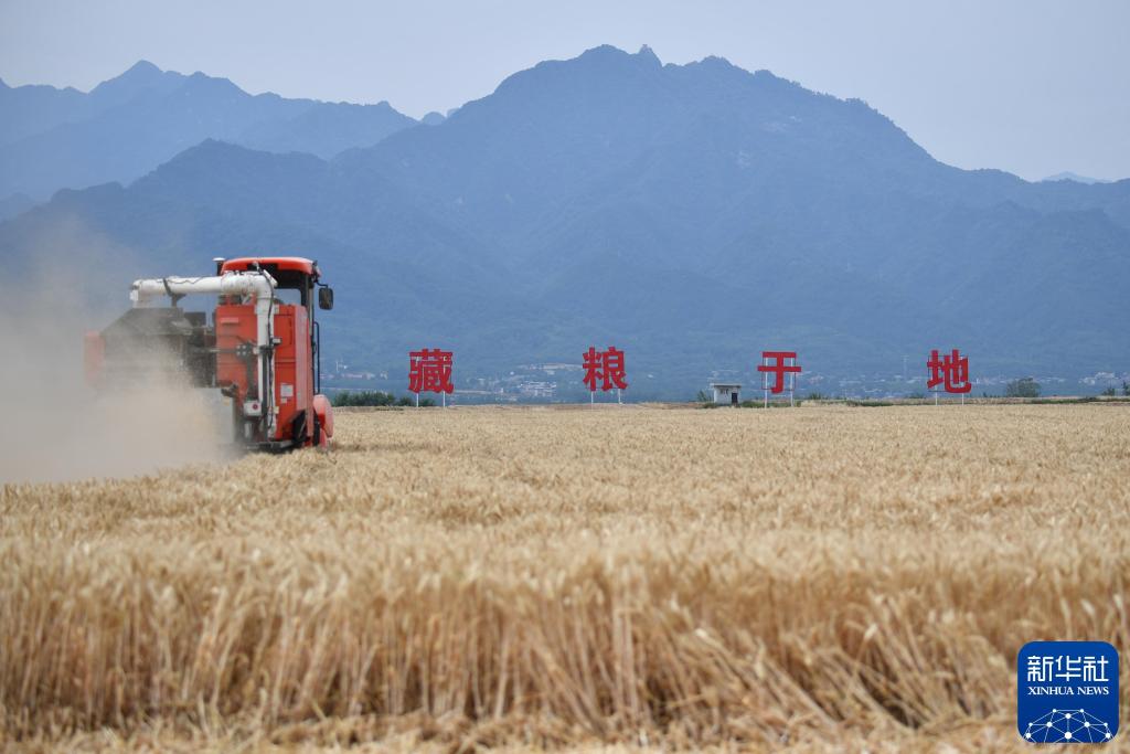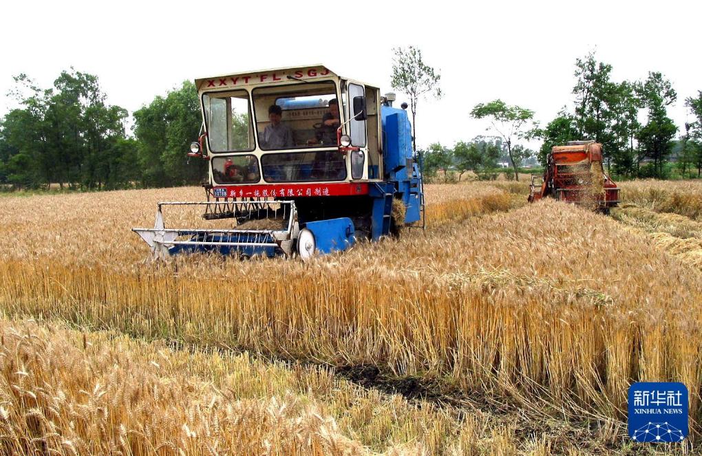 2025年6月5日,在河南省武陟县嘉应观镇吴小营村的一处麦田,村民驾驶农机收获小麦。新华社发(王琳锋摄)