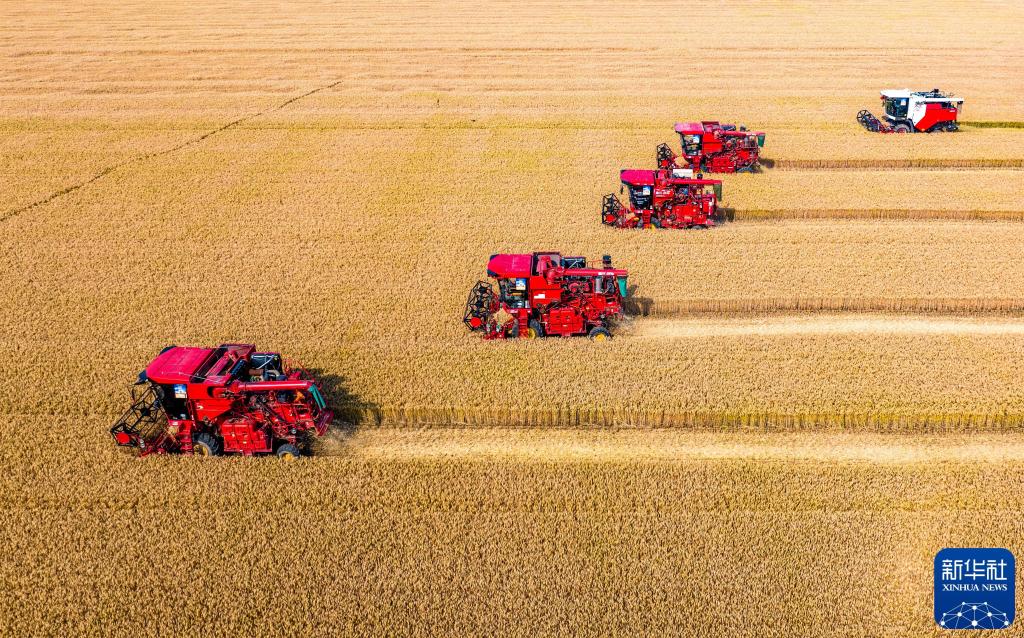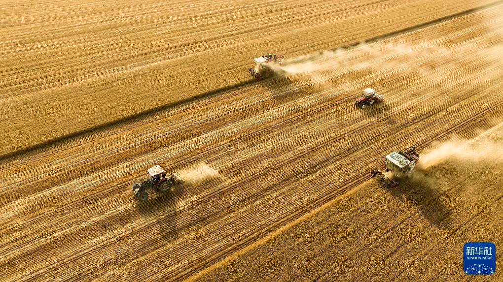 2024年5月29日,在河南省驻马店市西平县老王坡高标准农田,机收编队在收获小麦。新华社发(赵永涛 摄)