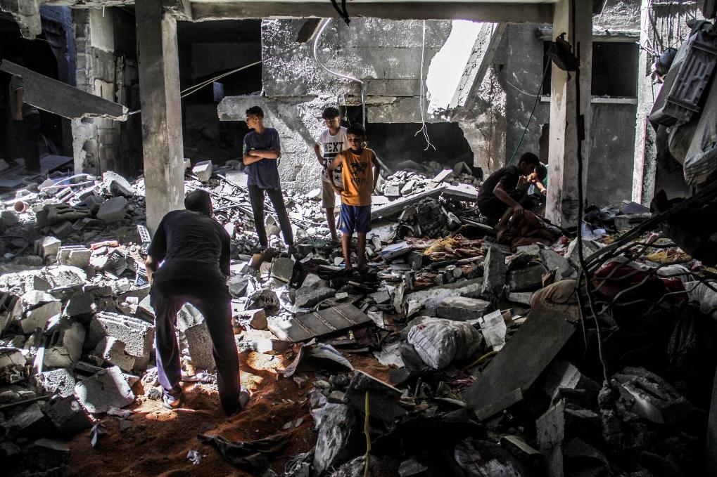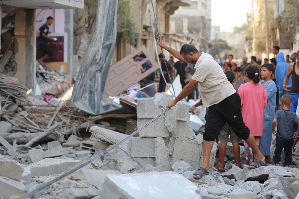 8月28日,在加沙地带北部的杰巴利耶难民营,人们查看遭以军轰炸后的建筑废墟。新华社发(马哈茂德·扎基摄)