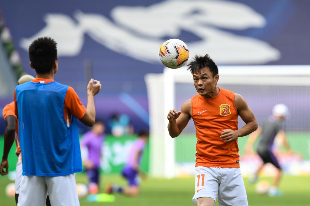 2020年9月28日,当时效力于武汉卓尔队的周通(右)在中超联赛第一阶段(苏州赛区)第14轮比赛的赛前训练中。新华社记者 李博 摄