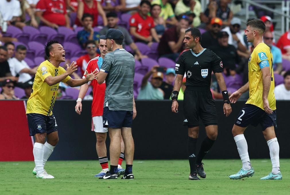在奥克兰城队与本菲卡队的比赛中,周通因不愿下场与队医发生争执。新华社/路透社