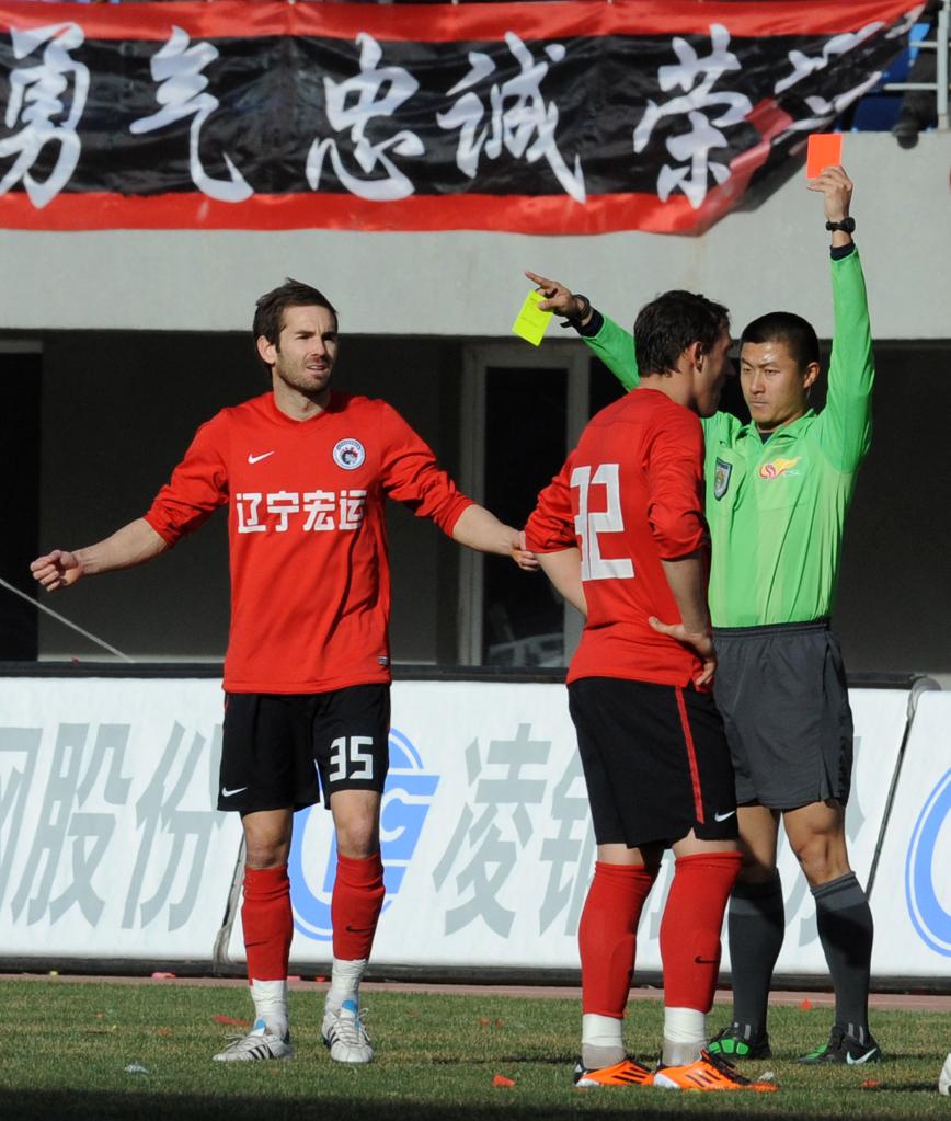 2011年4月10日,在2011赛季中超联赛第二轮比赛中,主裁判傅明(右)在比赛中向辽宁宏运队球员戴恩(左)出示红牌。新华社记者 李钢 摄