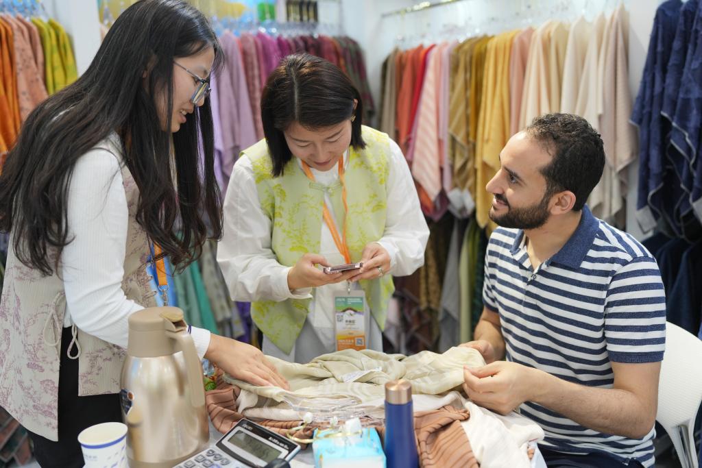 5月6日,一名埃及客商在柯桥国际纺织品面辅料博览会上选购面料。新华社记者翁忻旸 摄
