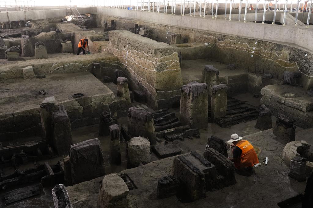 7月23日,鸟瞰绍兴城内的稽中遗址考古发掘现场(无人机照片)。新华社记者翁忻旸 摄