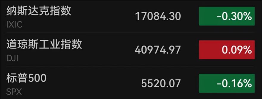 当地时间9月4日周三,美股三大股指涨跌不一。截至收盘,道指涨38.04点,涨幅为0.09%,报40974.97点;纳指跌52.00点,跌幅为0.30%,报17084.30点;标普500指数跌8.86点,跌幅为0.16%,报5520.07点。