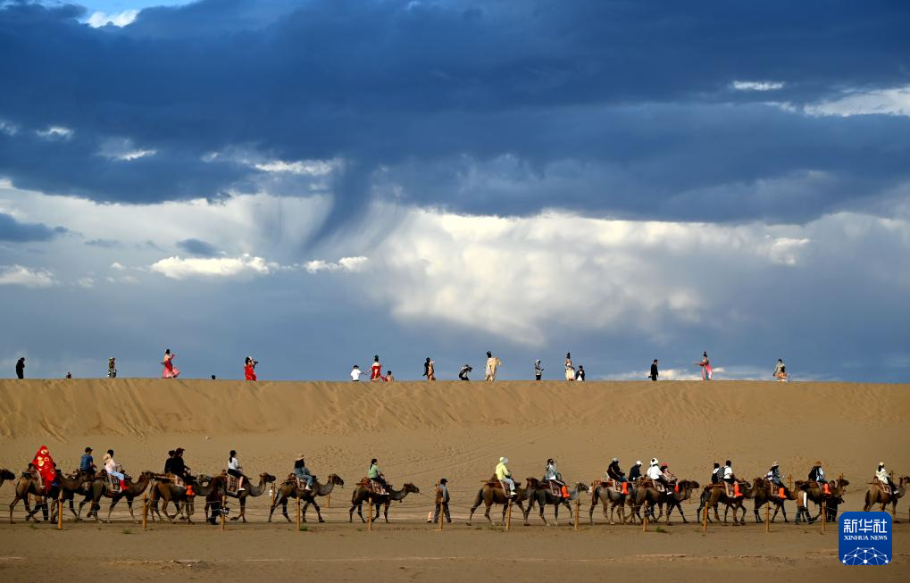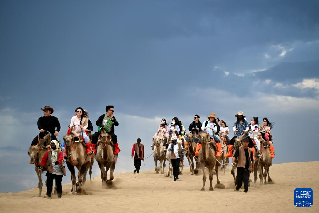 6月21日,游客在甘肃省敦煌市鸣沙山月牙泉景区骑骆驼游览。
