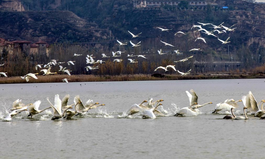 在山西平陆县黄河湿地,成群的白天鹅在水面上嬉戏。新华社记者王飞航 摄