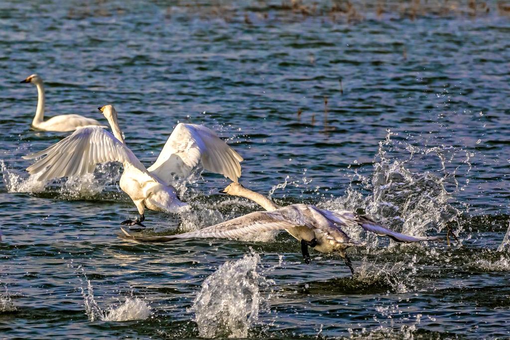 在山西平陆黄河湿地,白天鹅在水面上练习起降,为长途迁徙做准备。新华社记者王飞航 摄