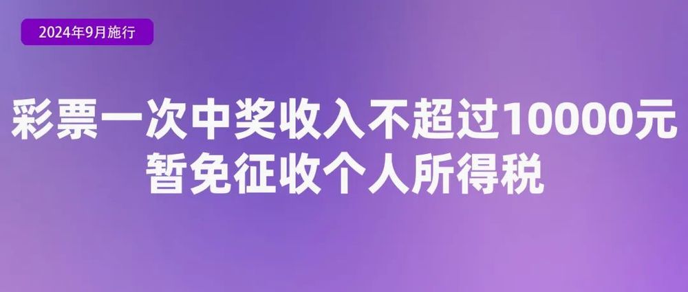 财政部、国家税务总局等四部门联合发布《关于彩票兑奖与适用税法有关口径的公告》。《公告》发布后,继续执行对彩票一次中奖收入不超过10000元暂免征收个人所得税的优惠政策。《公告》明确,电脑彩票以同一人在同一期同一游戏中获得的全部奖金为一次中奖收入,即开型彩票以一张彩票奖金为一次中奖收入。兑奖金额超过3000元的,应登记中奖人相关实名信息和兑奖信息,中奖人应主动配合做好登记工作。《公告》自2024年9月1日起执行,2024年9月1日前已销售,仍在兑奖有效期内但尚未兑奖的彩票,按《公告》规定执行。