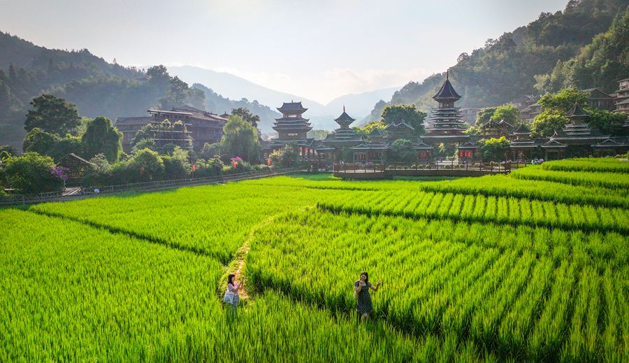 太阳爬上云端照进侗乡传统村落,鼓楼边吊脚楼炊烟升起,风雨桥下行人渐多,田间水稻拔节抽穗……立秋过后,贵州省黔东南苗族侗族自治州黎平县肇兴侗寨铺开一幅美丽的乡村画卷,别是一番景致。(赢光万 周远钢)