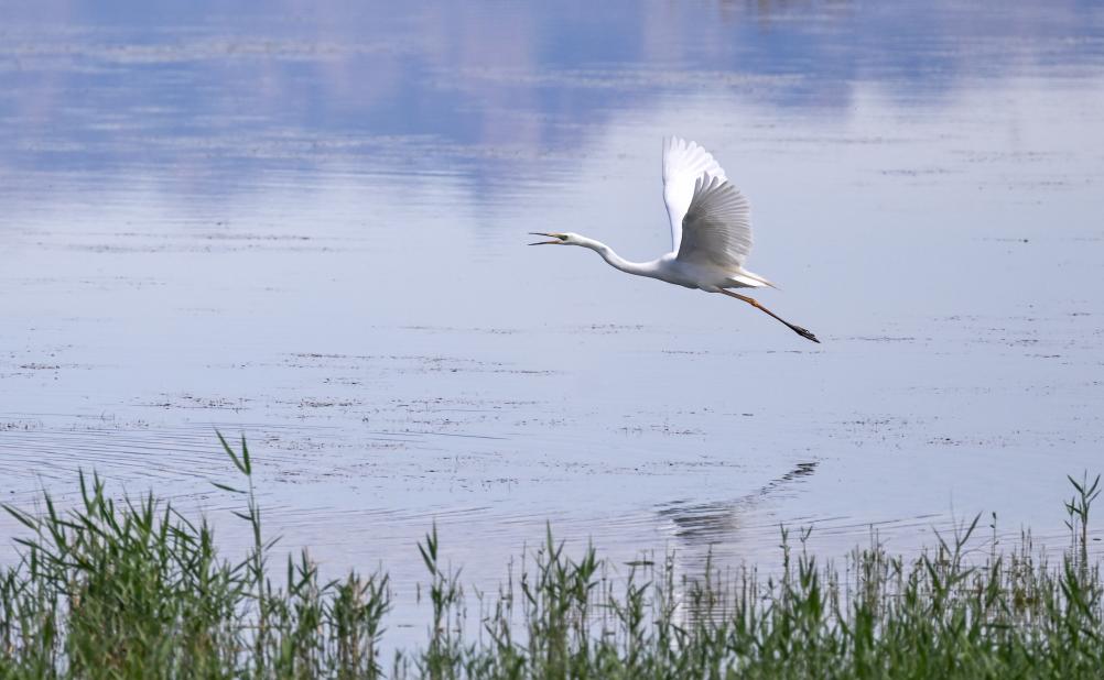 6月4日,一只白鹭飞过乌梁素海。新华社记者连振摄