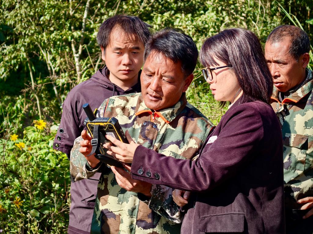 腊疯与勐海县林业部门工作人员一同运用云集林调通(林业测绘专用平板电脑)巡护。何沅蓉 摄