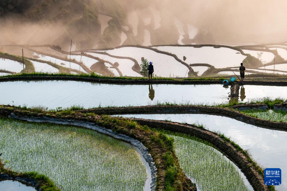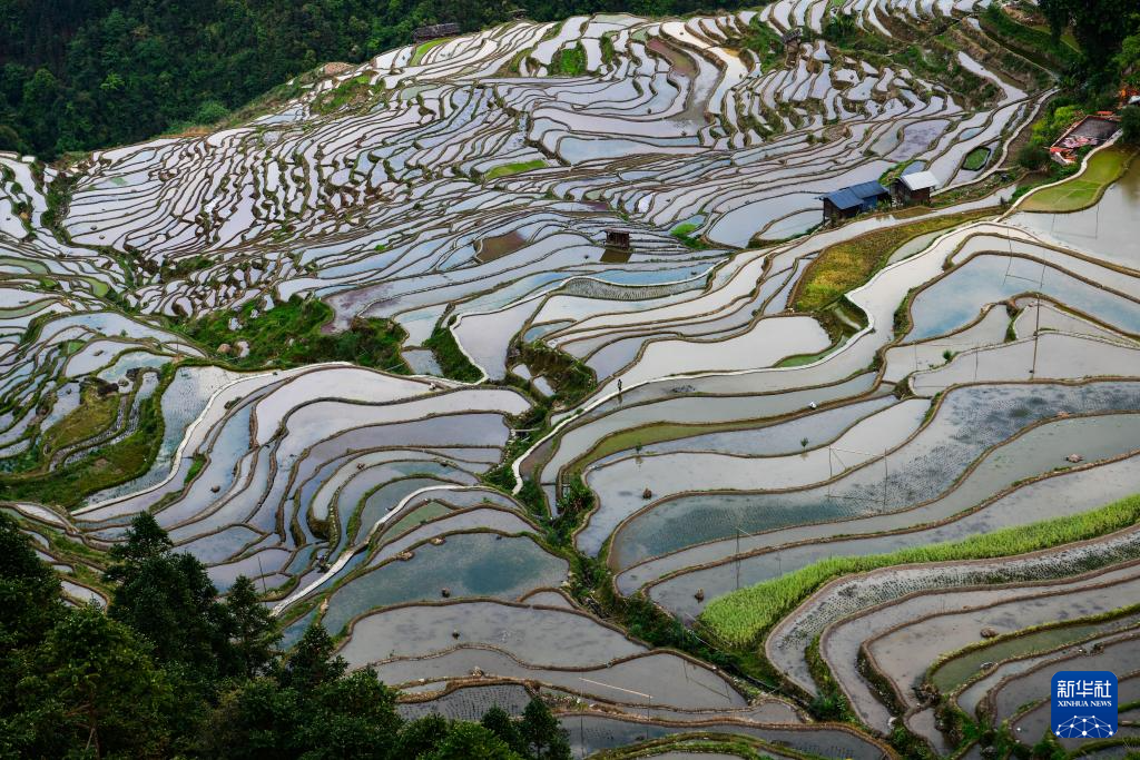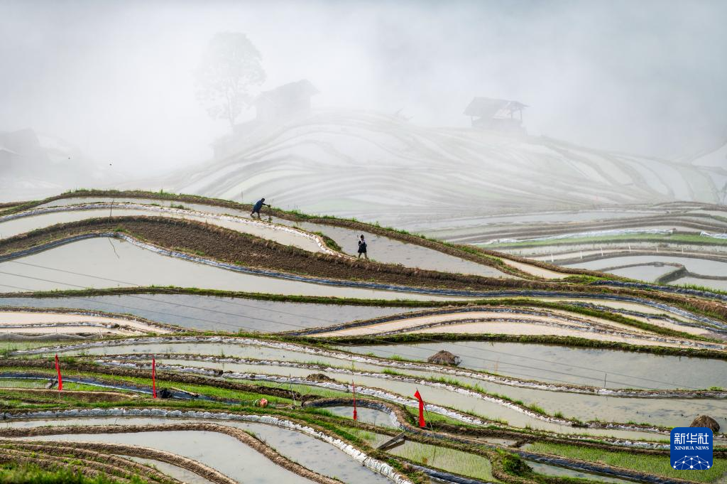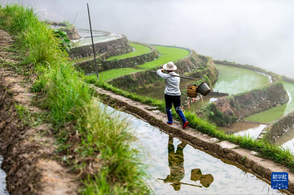 4月28日,村民在贵州省从江县加榜梯田查看稻田蓄水情况。