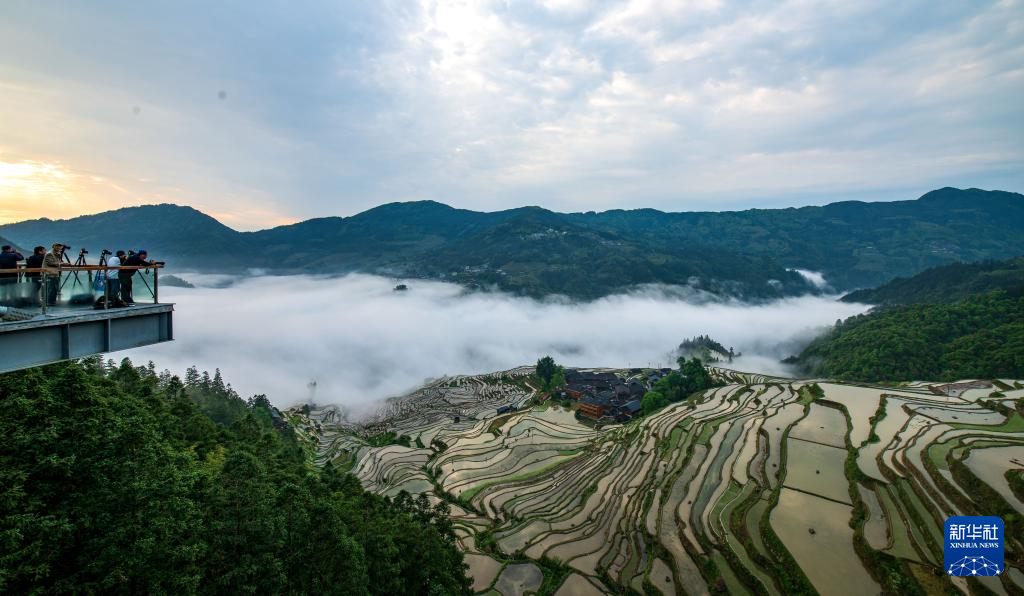 4月28日,游客在贵州省从江县加榜梯田拍照。新华社发(吴德军 摄)