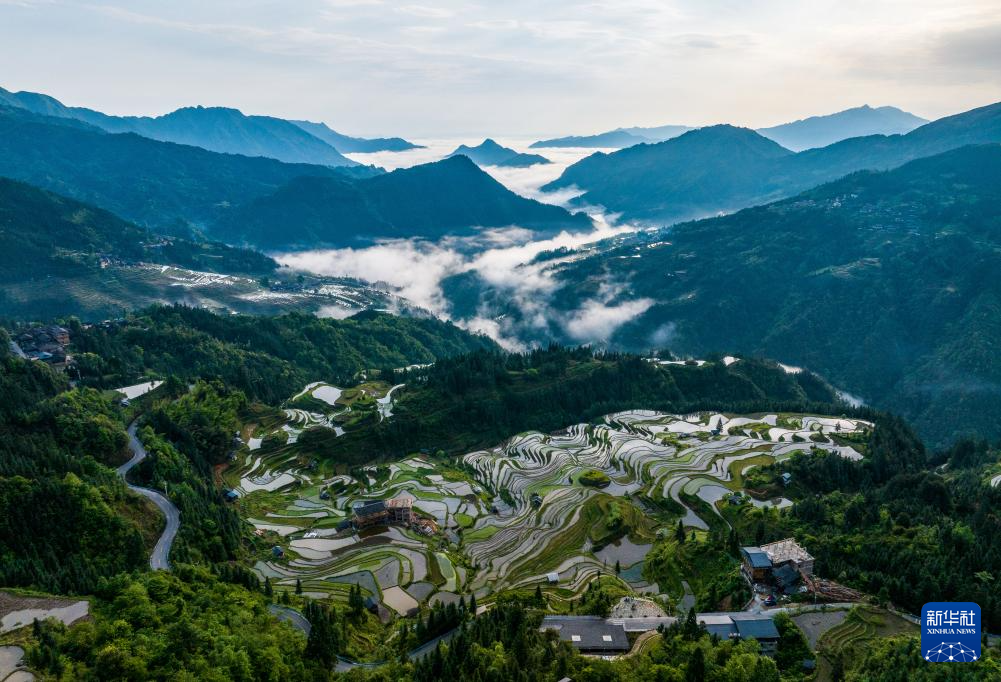 这是4月28日拍摄的贵州省从江县加榜梯田晨景(无人机照片)。新华社发(吴德军 摄)