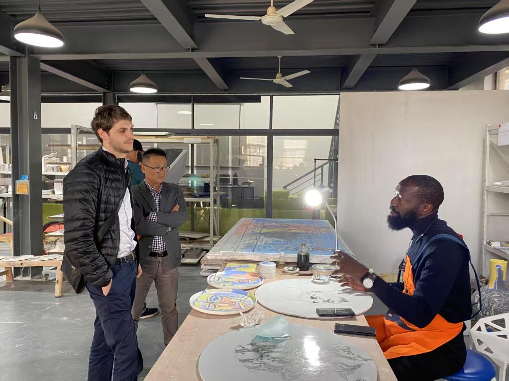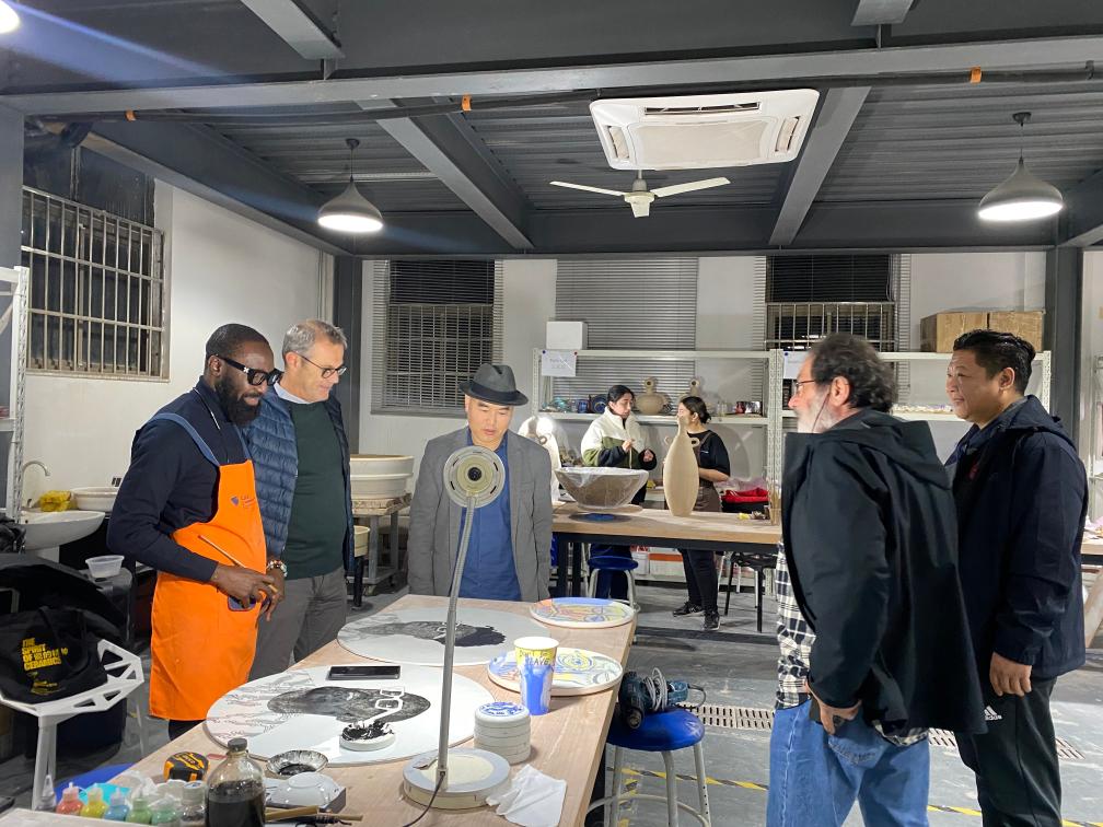 在景德镇陶瓷大学国际陶艺工作室,刚果(金)陶艺家姆万加·斯坦尼斯正在与艺术家们交流创作心得。(受访者供图)