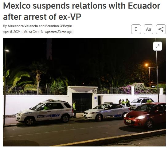 同日,厄瓜多尔警察强行进入墨西哥驻厄瓜多尔大使馆并逮捕了格拉斯, 洛佩斯随后指示墨外交部中止与厄瓜多尔的外交关系,称逮捕是“专制”行为,违反了国际法并侵犯了墨西哥主权。(完)
