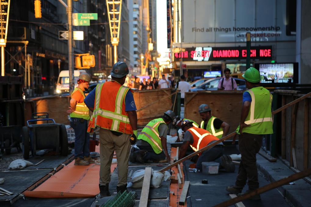 6月24日,建筑工人在美国纽约曼哈顿街头工作。新华社记者刘亚南摄