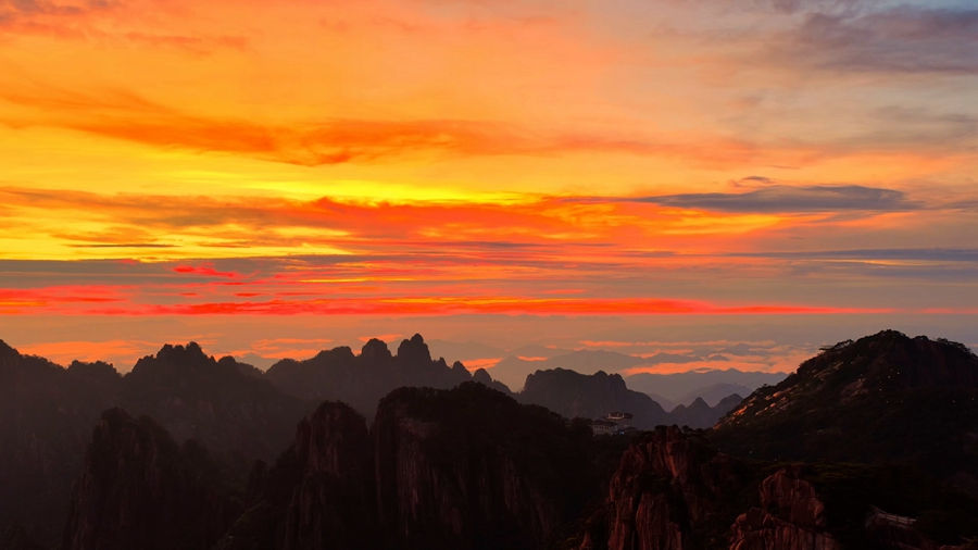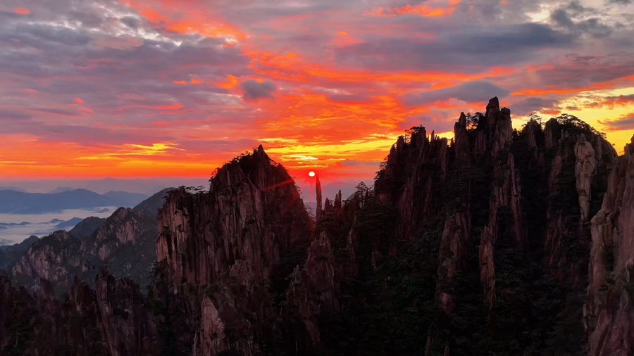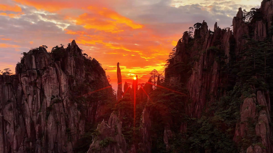 夏日清晨,伴随着旭日东升,灿若锦绣的云霞肆意铺展在黄山的千峰万壑间,与奇松、怪石齐聚同框,绘就出一幅幅浓墨重彩的油画,令人心潮澎湃。