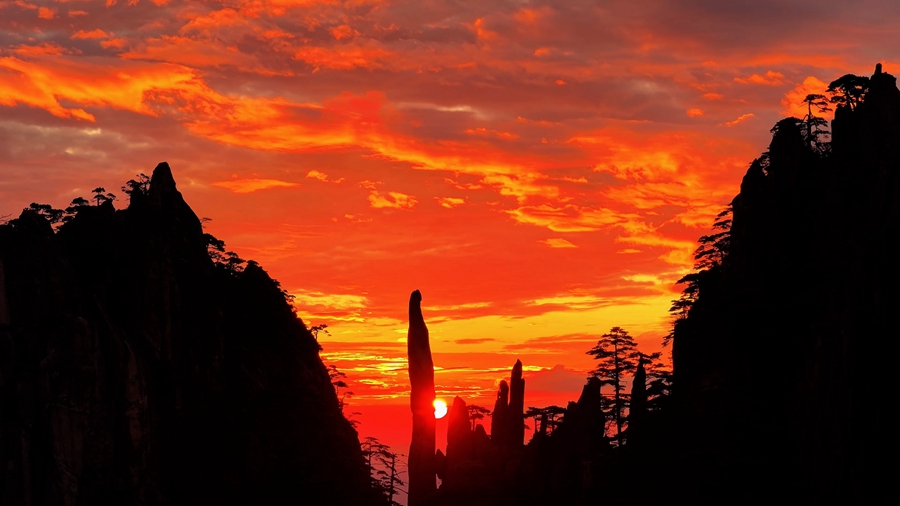 夏日清晨,伴随着旭日东升,灿若锦绣的云霞肆意铺展在黄山的千峰万壑间,与奇松、怪石齐聚同框,绘就出一幅幅浓墨重彩的油画,令人心潮澎湃。(侯瑞冬)