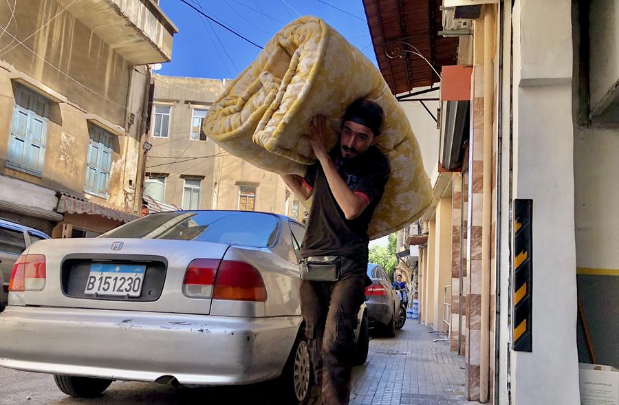 9月23日,在黎巴嫩首都贝鲁特,一位当地民众为来自南部地区的无家可归者搬运床垫。新华社发(比拉尔·贾维希摄)